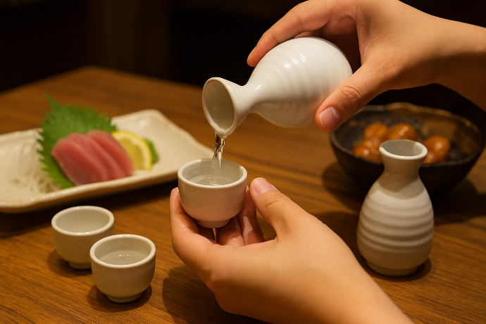 Es costumbre hacer una leve inclinación de cabeza al servir o recibir el sake, como muestra de respeto.