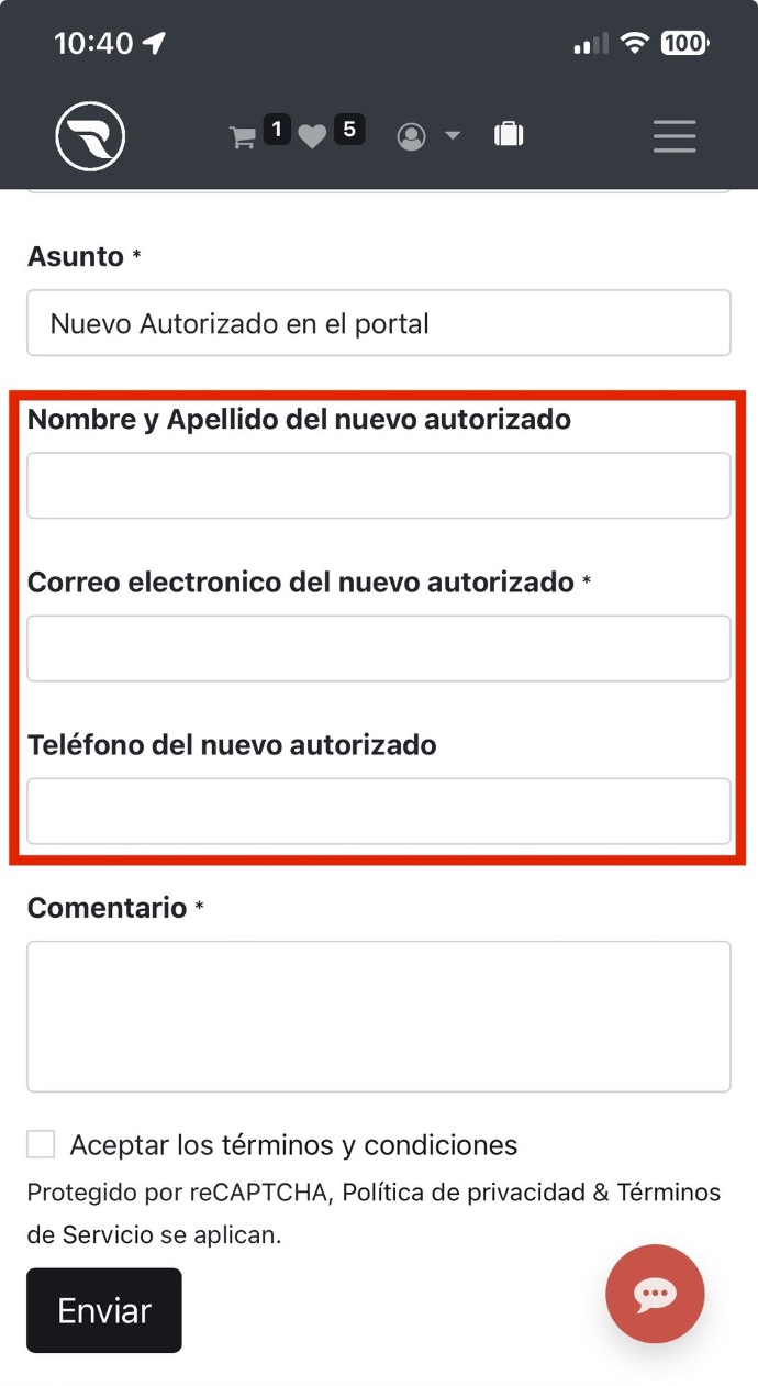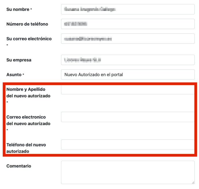 Es muy fácil, para realizar el alta de un nuevo autorizado solo tienes que informarnos en el siguiente formulario de los datos: nombre y apellidos, correo electrónico y teléfono en los apartados siguientes al Asunto*: Nuevo Autorizado del portal.